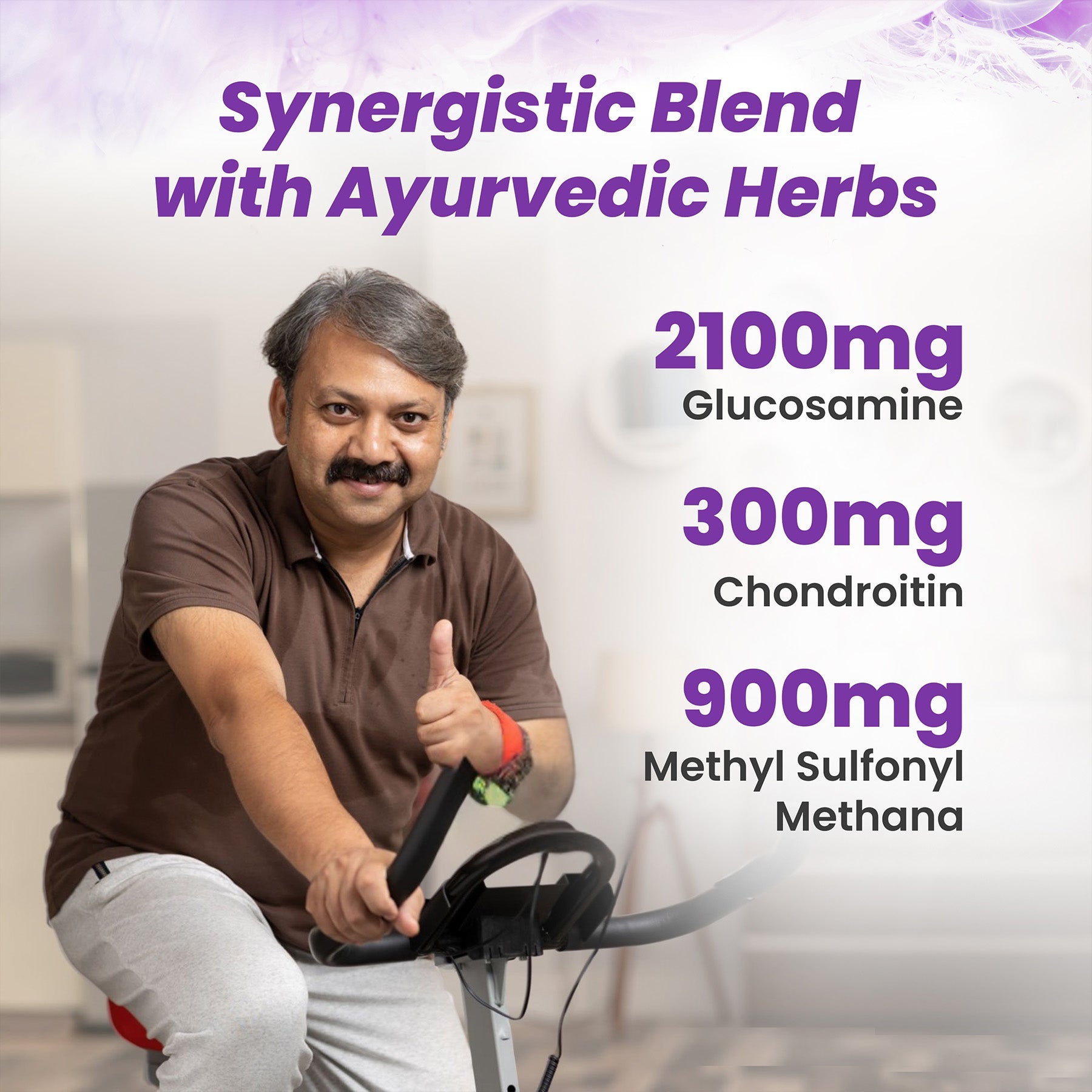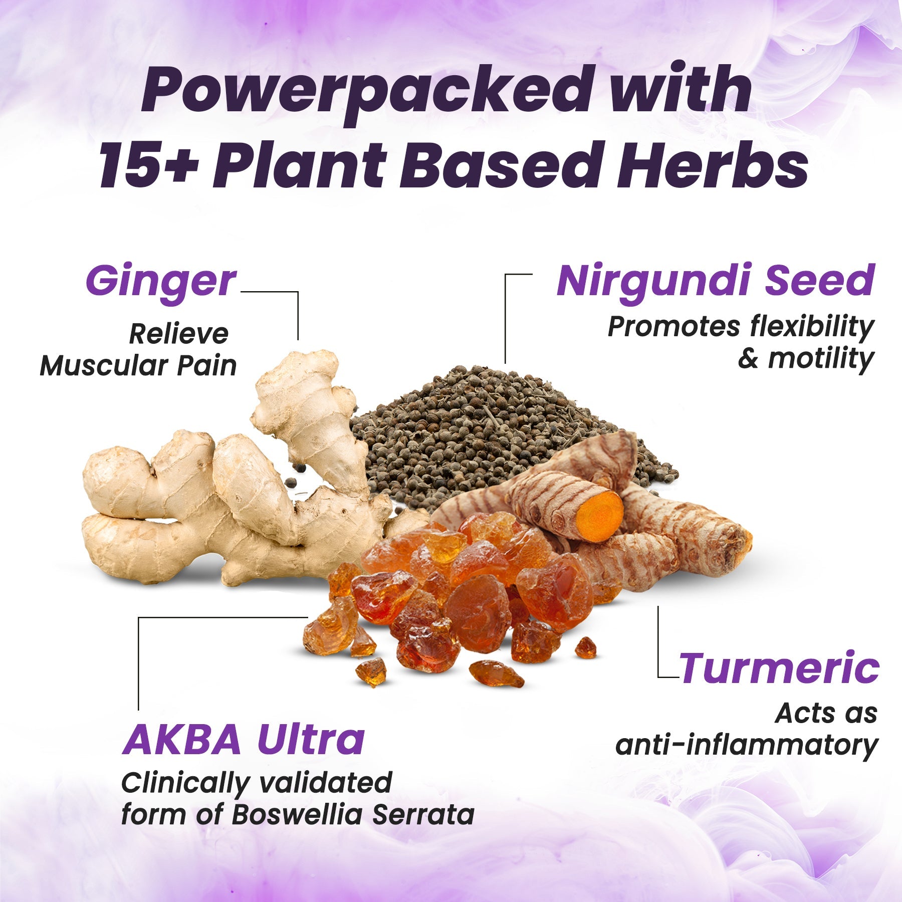 Boswellia (AKBA Ultra), Glucosamine, Chondroitin, Ginger, and other joint-supporting Ayurvedic herbs.