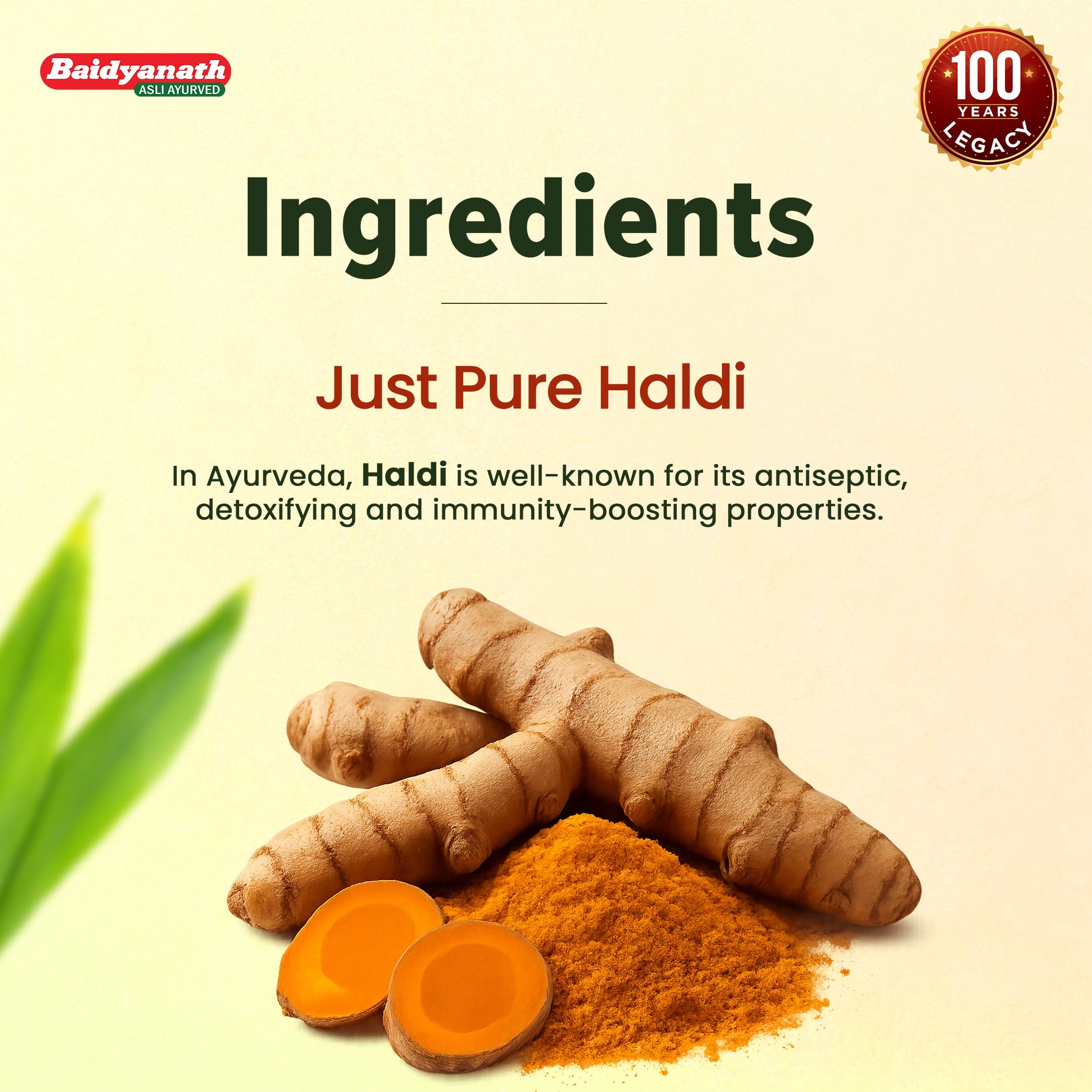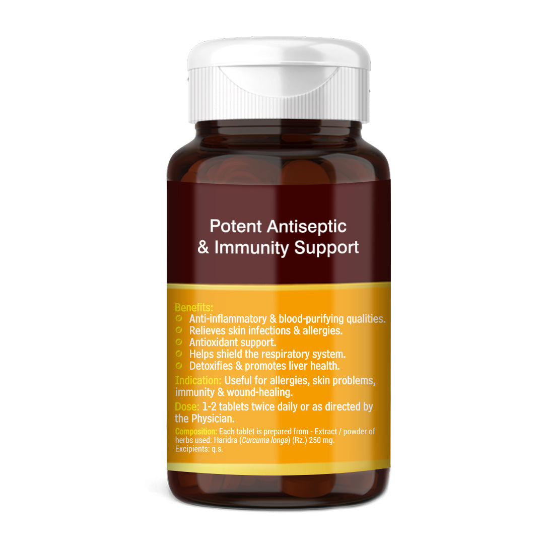 Baidyanath Haldi Tablet is a powerful Ayurvedic supplement made from pure turmeric (Haridra) extract, known for its potent antiseptic, anti-inflammatory, and anti-allergic properties. It naturally supports immunity, skin health, liver function, and respiratory wellness, while helping the body eliminate toxins and maintain internal balance.