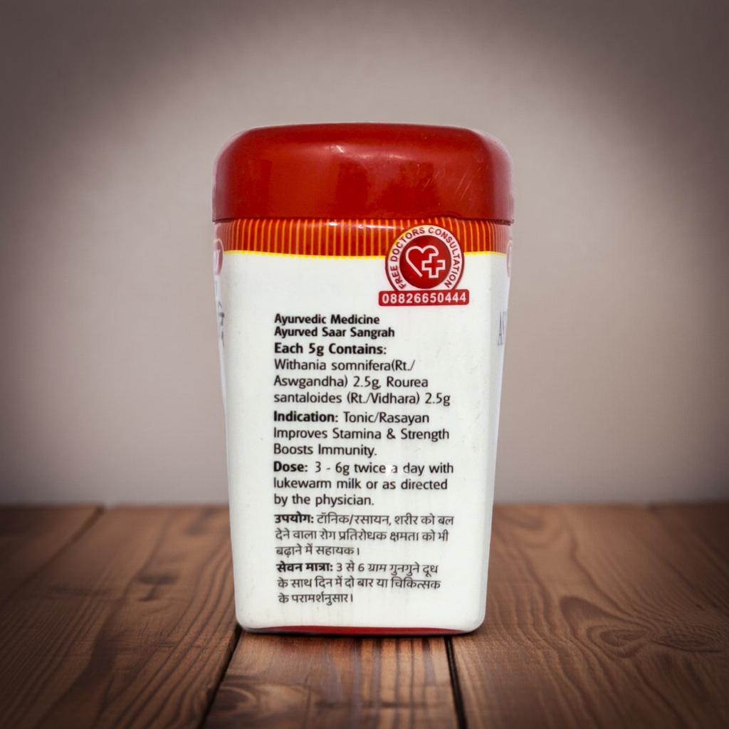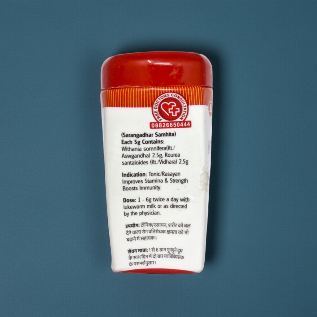 Baidyanath Jhansi Aswagandhadi Churna is a traditional Ayurvedic formulation designed to support vitality, strength, and overall well-being. Enriched with the goodness of Ashwagandha (also known as Indian Ginseng or Winter Cherry) and Vidhara, this herbal blend is known for its adaptogenic and revitalizing properties.