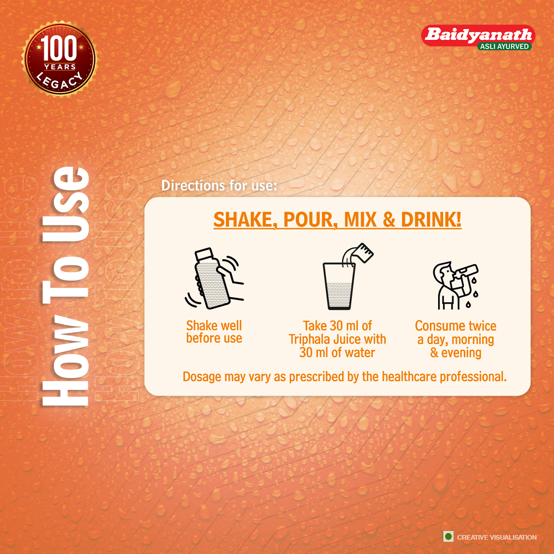 Consume 30 ml of Baidyanath Premium Triphala Juice mixed with a glass of water twice daily before meals, or as directed by your physician.
