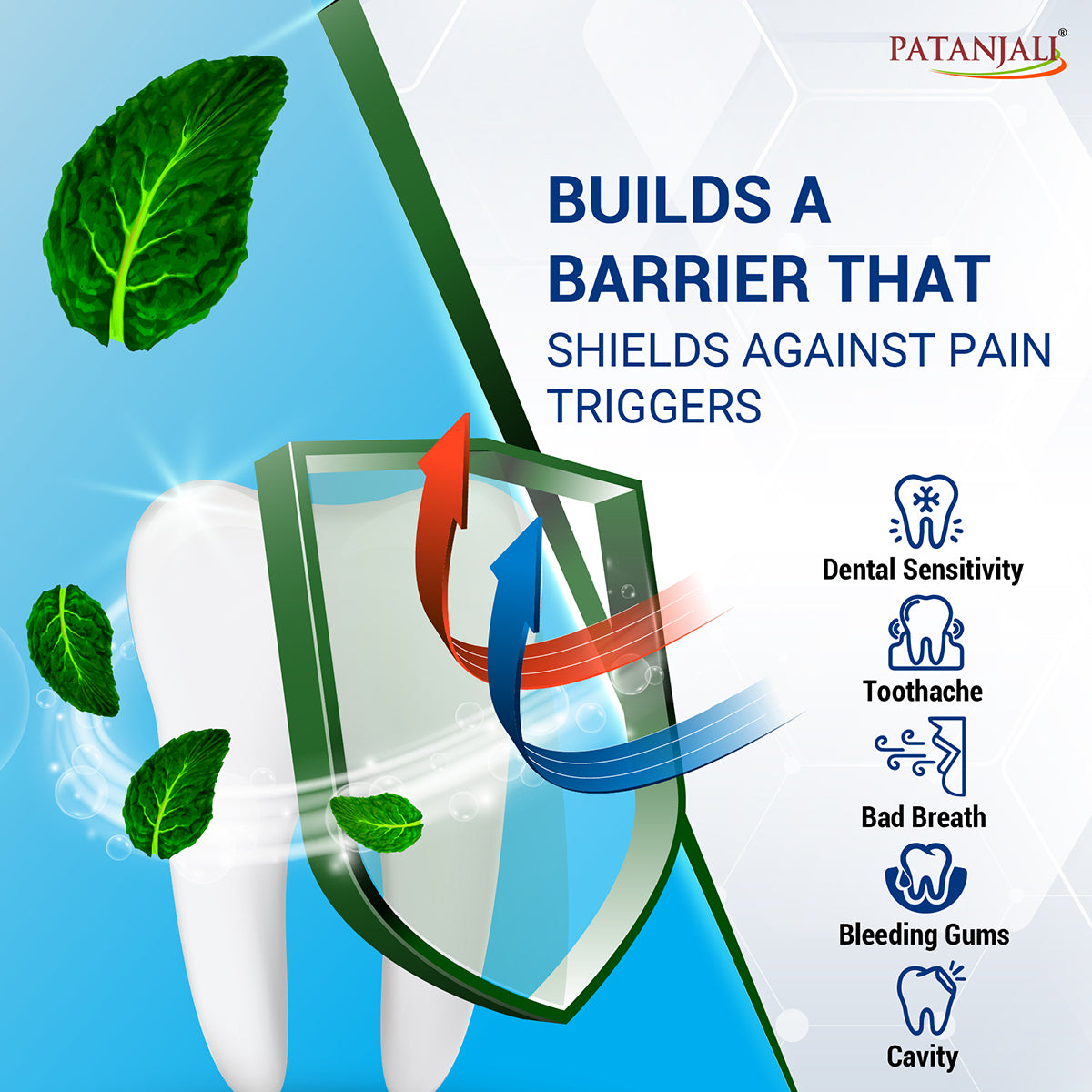 Patanjali Dant Kanti Sensitive Toothpaste is formulated to help reduce dentinal sensitivity, soothe toothache, and support gum health. It gently cleans teeth, helps control bad breath, and strengthens the gums with herbal actives.