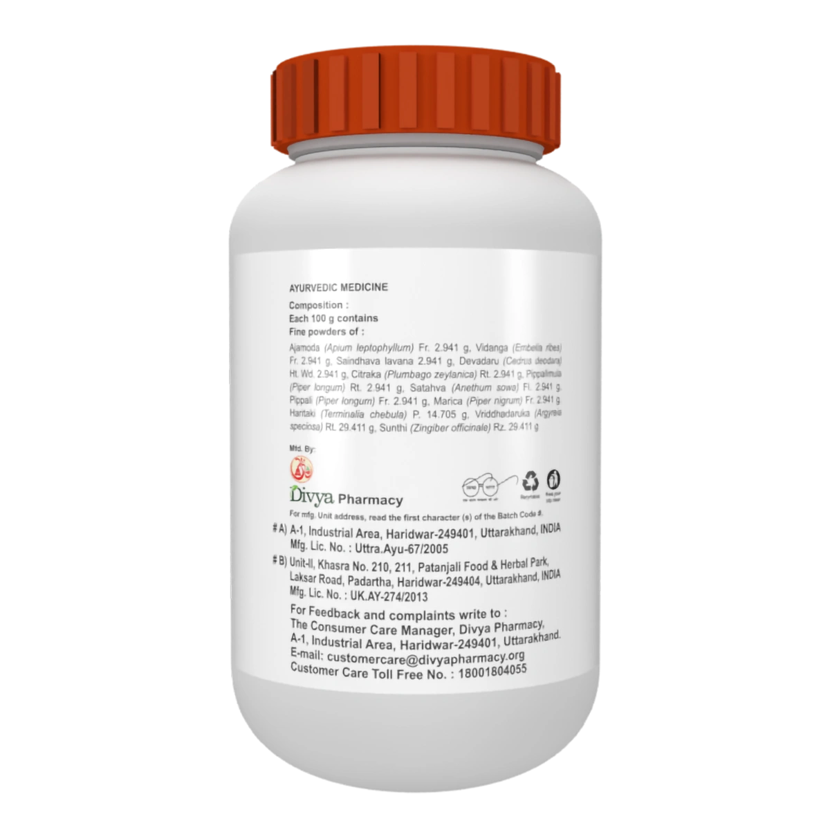 Patanjali Ajmodadi Churna is a classical Ayurvedic herbal blend prepared from potent ingredients such as Ajamoda, Vidanga, Saindhava Lavana, Devadaru, Citraka, Pippalimula, Satahva, Pippali, Marich, Haritaki, Vriddhadaruka and Sunthi. These traditional herbs are known in Ayurveda for supporting digestive balance, maintaining internal comfort, and helping the body sustain natural metabolic harmony.