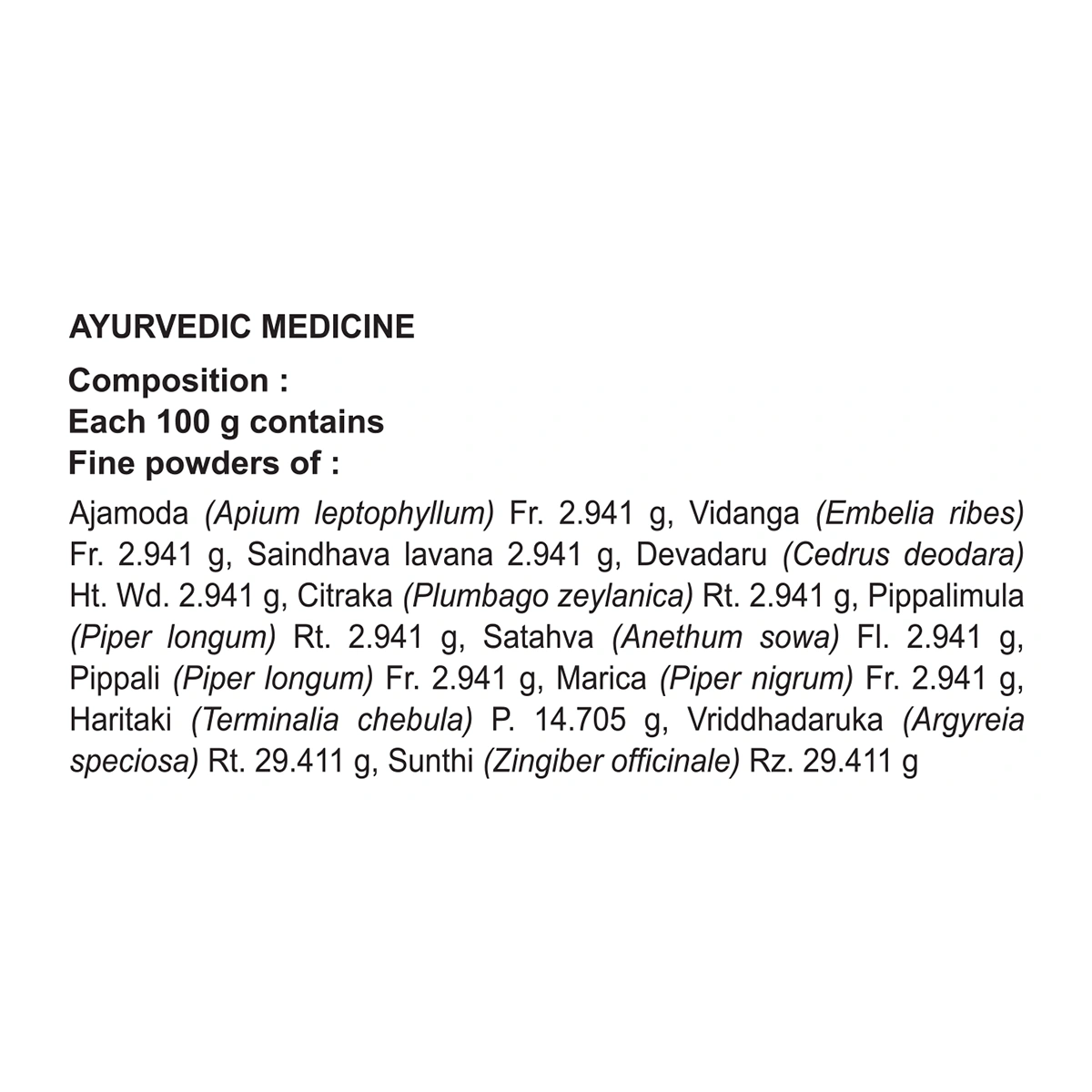 Ajamoda, Vidanga, Saindhava Lavana, Devadaru, Citraka, Pippalimula, Satahva, Pippali, Marica, Haritaki, Vriddhadaruka, Sunthi