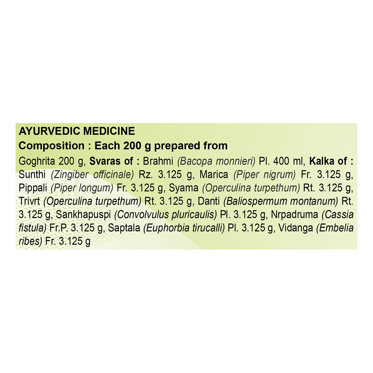Brahmi, the key ingredient, is traditionally regarded as a medhya (mind-supporting) herb. The formulation may help promote calmness, support natural focus, and encourage balanced cognitive functioning as part of a daily wellness routine. Prepared through the classical ghrita infusion method, this herbal ghee ensures deeper assimilation of nutrients, offering broad benefits for internal balance and overall well-being.