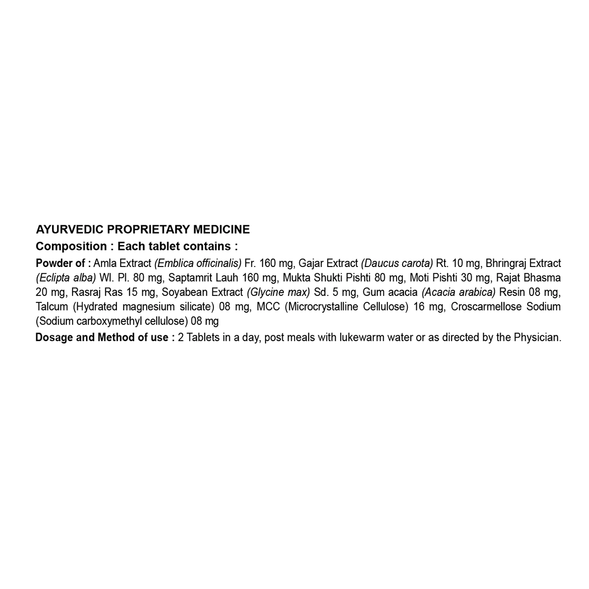 Amla Extract, Gajar Extract, Bhringraj Extract, Saptamrit Lauh, Mukta Shukti Pishti, Moti Pishti, Rajat Bhasma, Rasraj Ras, Soyabean Extract