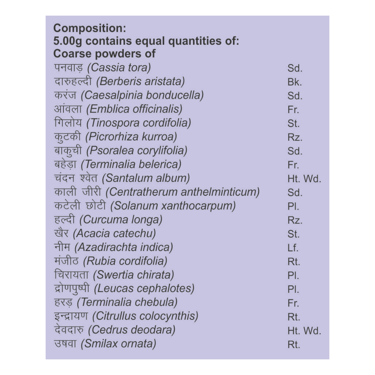 Panvad, Daru Haldi, Karanj, Haldi, Neem, Manjishtha, Kalijeeri, Chandan Swet, Amla, Giloy, Kutki, Bakuchi, Baheda, Khair, Chirayta, Dronpushpi, Harad, Choti Kateli, Indrayan Mool, Devdaru, Ushva