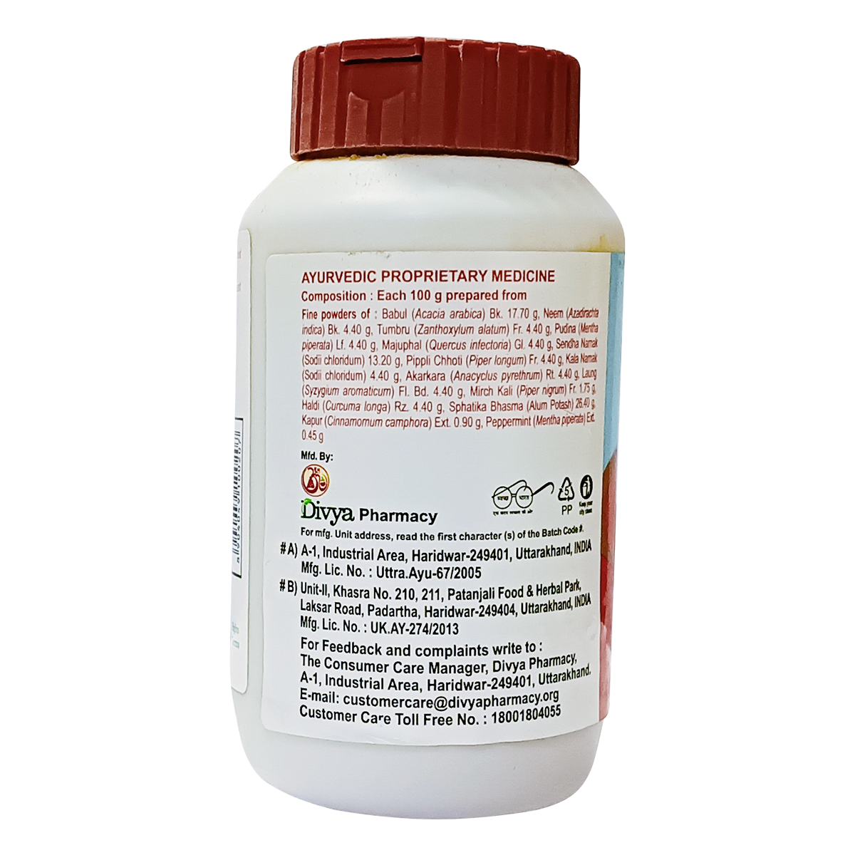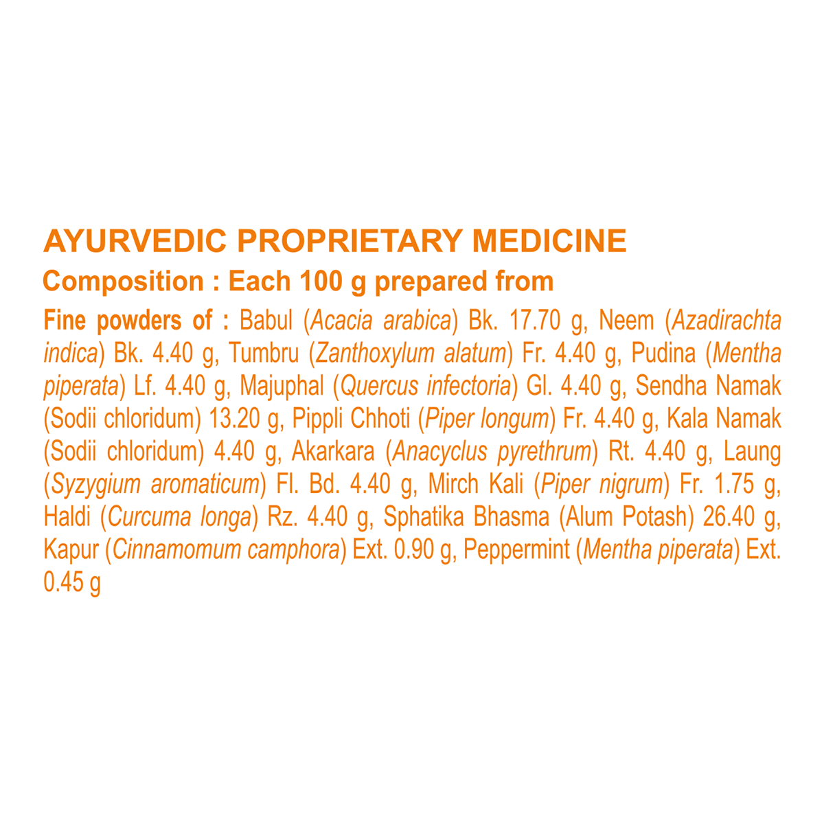 Babul, Neem, Tumbru, Pudina, Majuphal, Sendha Namak, Pippli Chhoti, Kala Namak, Akarkara, Laung, Kali Mirch, Haldi, Sphatika Bhasma, Kapur, Peppermint