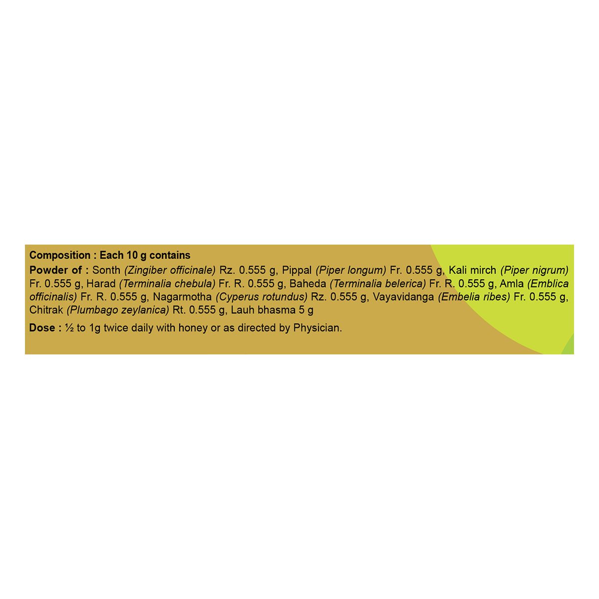 Sonth, Pippali, Kali Mirch, Harad, Baheda, Amla, Nagarmotha, Vayavidanga, Chitrak, Lauh Bhasma