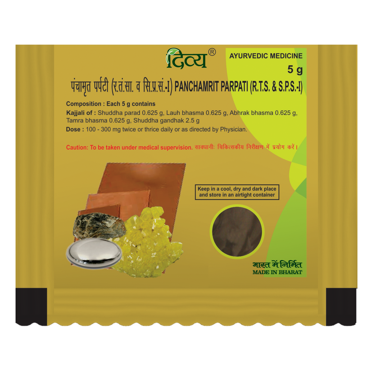 Patanjali Panchamrit Parpati is a classical Ayurvedic formulation prepared using traditional bhasmas such as Lauh Bhasma, Abhrak Bhasma, Tamra Bhasma, Shuddha Parad, and Shuddha Gandhak. These ingredients are traditionally valued for helping support digestion, internal balance, and overall wellness.