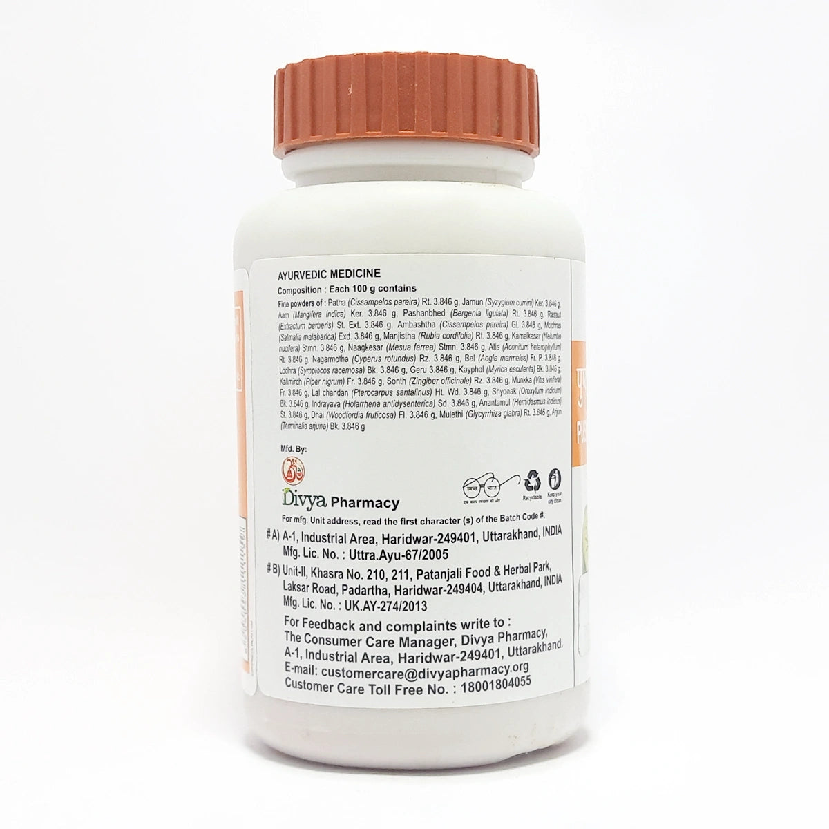 Patha, Jamun, Aam, Pashanbhed, Rasaut, Ambashtha, Mochras, Manjistha, Kamalkesar, Naagkesar, Atis, Nagarmotha, Bel, Lodhra, Geru Kayphal, Kalimirch, Sonth, Munkka, Lal Chandan, Shyonak, Indrayava, Anantamul, Dhai, Mulethi, Arjun