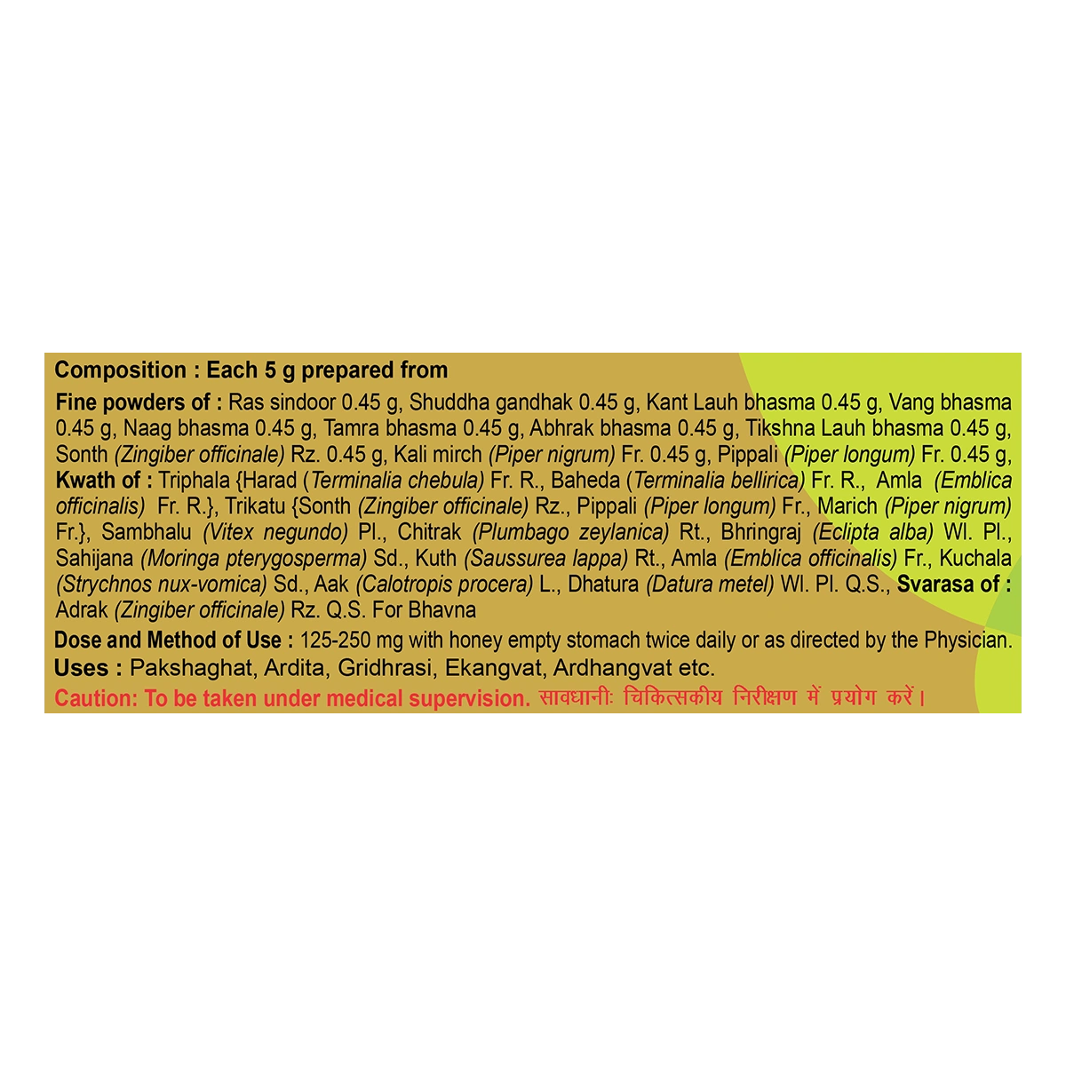 Ras Sindoor, Shuddha Gandhak, Kant Lauh Bhasma, Vang Bhasma, Naag Bhasma, Tamra Bhasma, Abhrak Bhasma, Tikshna Lauh Bhasma, Sonth, Kali Mirch, Pippali, Triphala Kwath (Harad, Baheda, Amla), Trikatu (Sonth, Pippali, Marich), Sambhalu, Chitrak, Bhringraj, Sahijana, Kuth, Amla, Kuchala, Aak Dhatura, Adrak Svarasa