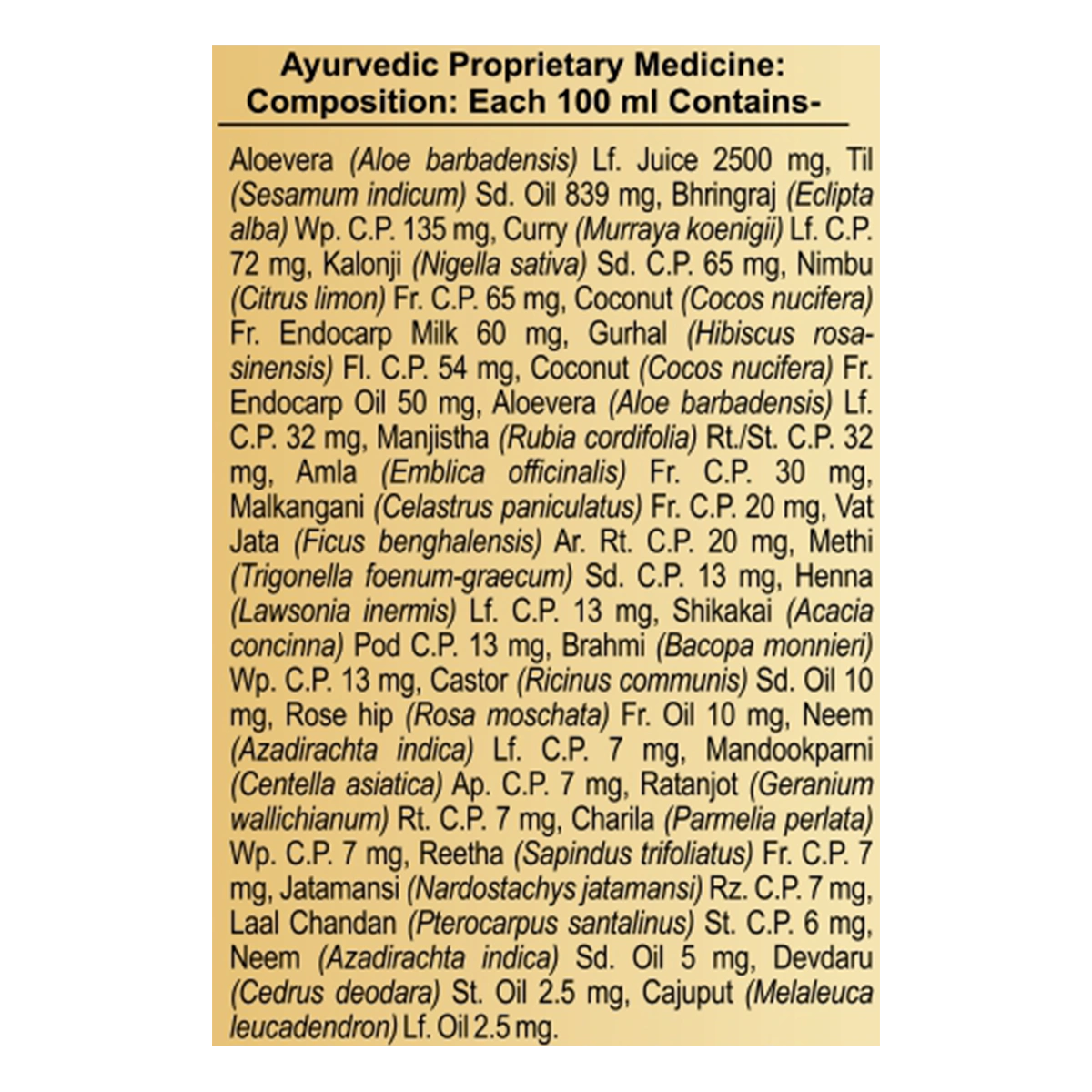 Bhringraj, Curry leaves, Kalonji, Amla, Aloe vera, Hibiscus, Lal Chandan, Nimbu, Methi, Neem, Henna, Shikakai, Malkangani, Brahmi, Manjistha, Mandookparni, Ratanjot, Charila, Reetha, Jatamansi, Vat Jata, Til Oil, Coconut Milk, Castor Oil, Rosehip Oil, Neem Seed Oil, Devdaru Oil, Tea Tree Oil.