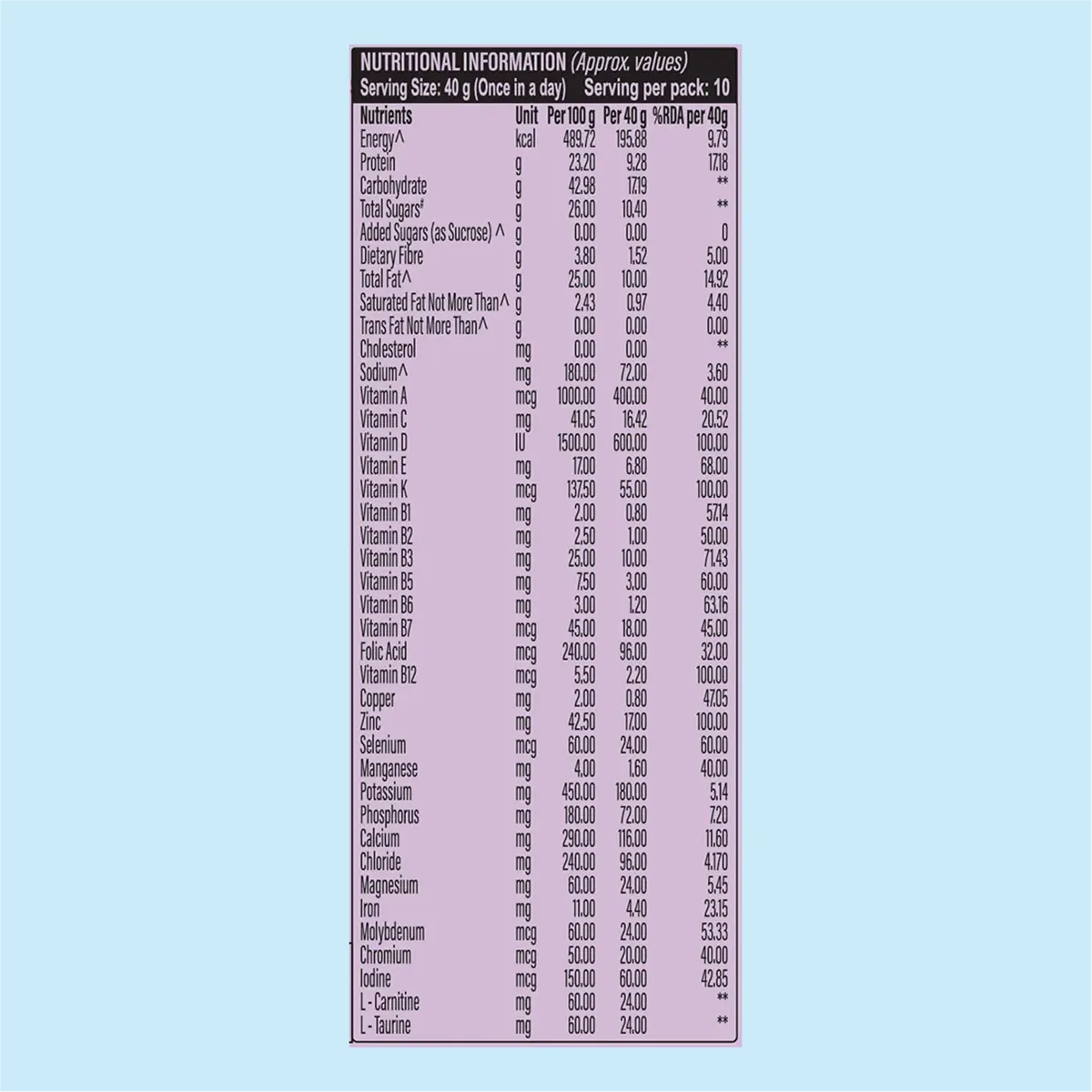 Whey Protein Concentrate, Milk Solids, Botanical Extracts (Amla, High Oleic Sunflower Oil Powder, FOS, Punarnava, Gokhru, Carotenoids, Rose Hips, Soya, Spinach), Anti-caking Agent (INS 551), Natural Identical Flavours, Minerals (Phosphorus, Potassium, Zinc, Calcium, Magnesium, Iron, Manganese, Copper, Iodine, Selenium, Molybdenum, Chromium), Stabilizer (INS 415), Vitamin Premix (A, B1, B2, B3, B5, B6, B7, B9, B12, D, C, E, K2), Amino Acids (L-Carnitine, L-Taurine), Emulsifier (INS 322(i)), Sweeteners (INS 950, INS 955)
