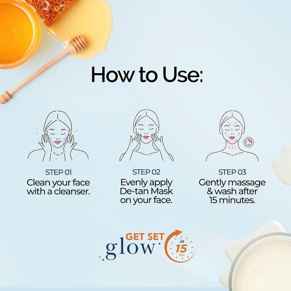 Reveal your natural glow with the De-Tan Brightening & Cooling Tan Removal Cream, a single-step face mask enriched with Honey, Kojic, and Milk extracts. This refreshing cream helps remove sun tan, reduce dark spots, and revive dull skin, leaving your complexion visibly brighter, hydrated, and more even-toned. The cooling effect soothes the skin after sun exposure while natural ingredients promote radiant, healthy-looking skin.
