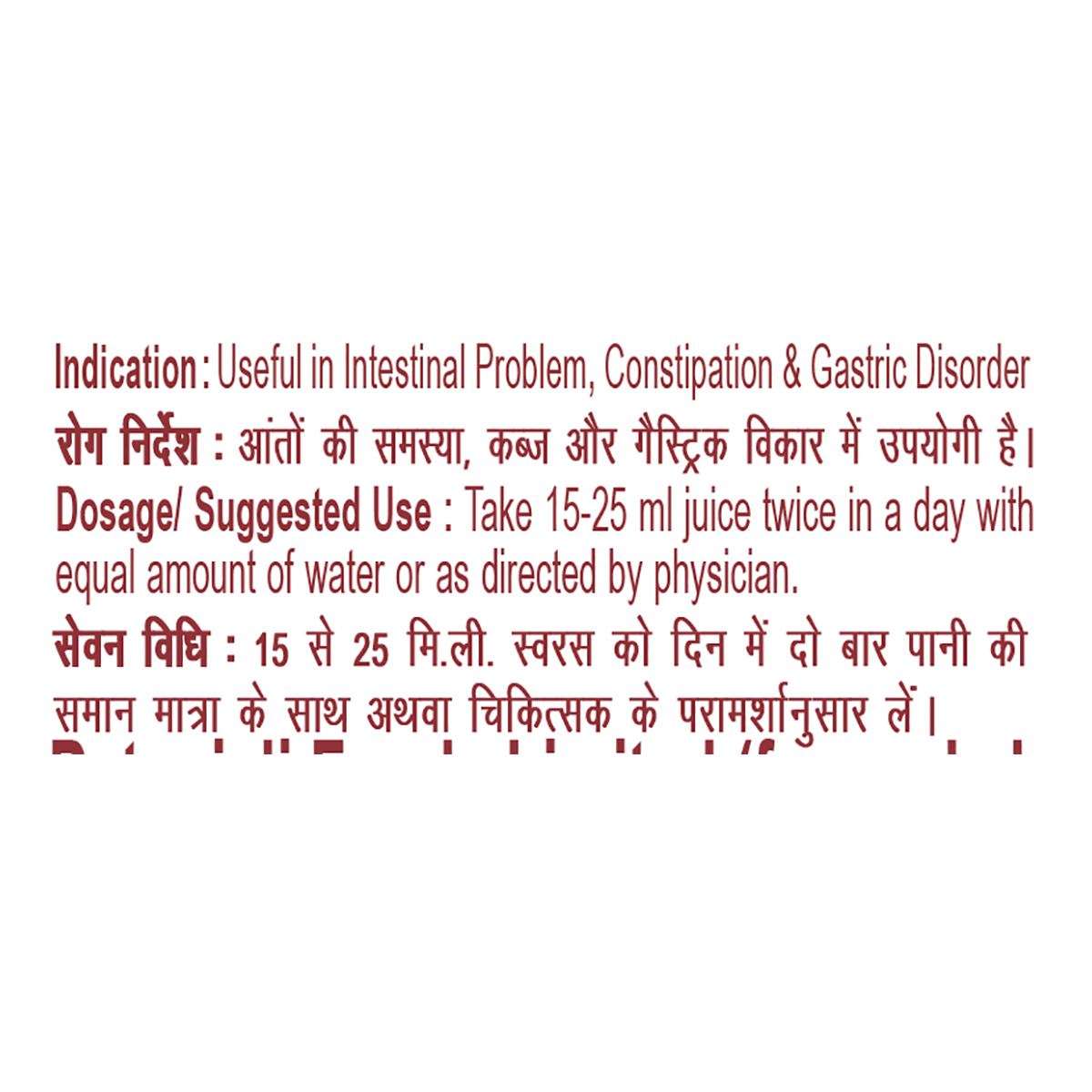 Each 10 ml contains: Amla (Emblica officinalis) 3.986 ml, Aloevera (Aloe barbadensis) 3.986 ml, Wheat Grass (Triticum sativum) 1.99 ml, along with Citric Acid as an excipient and preservatives Sodium Benzoate & Potassium Sorbate.
