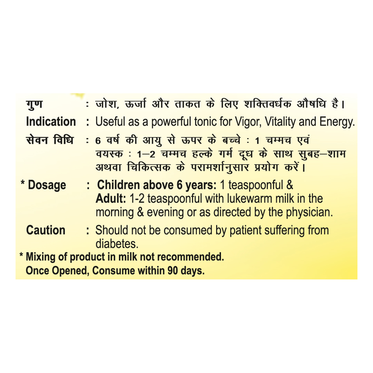 - Adults: 1–2 teaspoons with lukewarm milk, morning and evening, or as directed by a physician