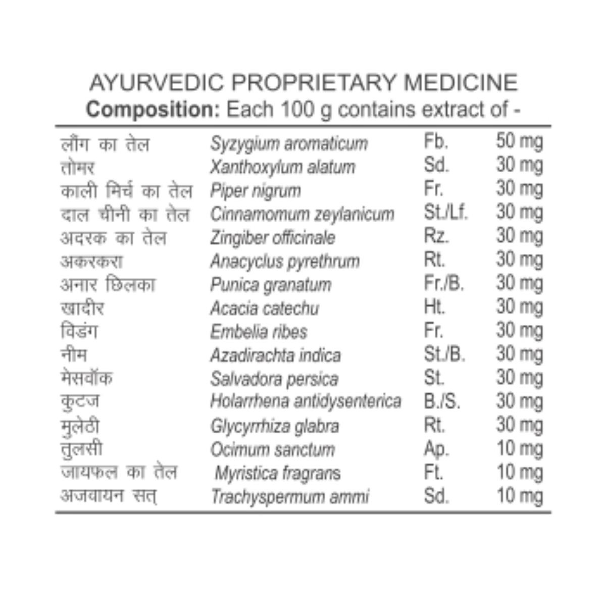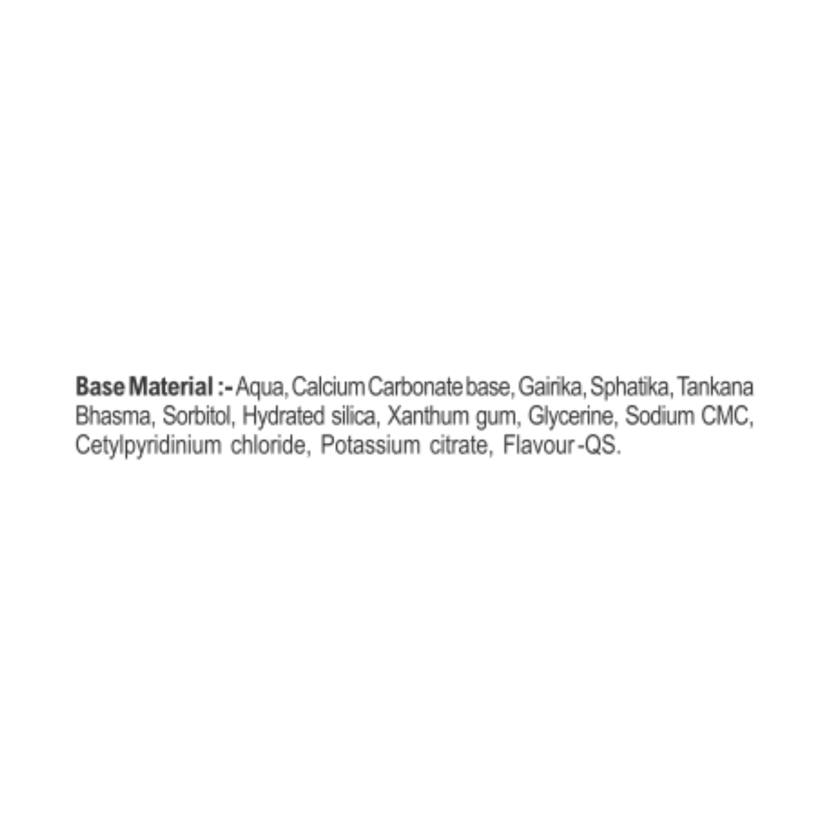 Aqua, Calcium Carbonate Base, Gairika, Sphatika, Tanka Silica, Xanthan Gum, Glycerine, Sodium CMC, Cetylpyridinium Chloride, Pota, Sodium Fluoride (approx. 924 ppm).