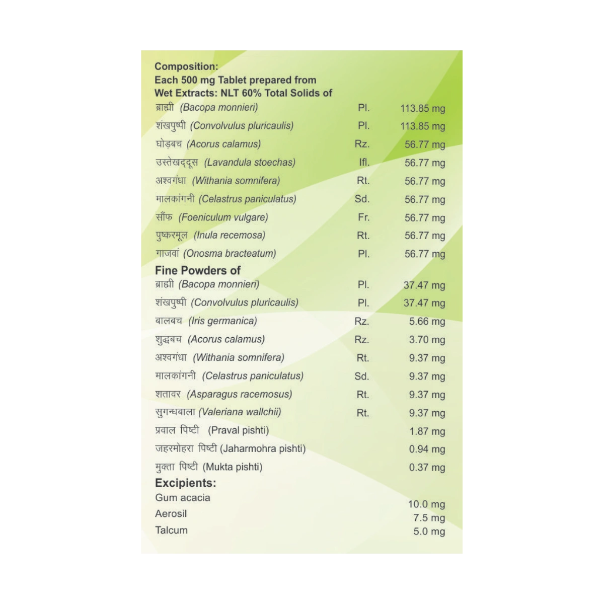 Brahmi, Shankhpushpi, Ghodbach, Ustekhaddus, Ashwagandha, Malkangani, Saunf, Pushkarmool, Ganjvan, Bal Bach, Shuddh Bach, Shatavar, Sugandhbala, Praval Pishti, Jaharmohra Pishti, Mukta Pishti