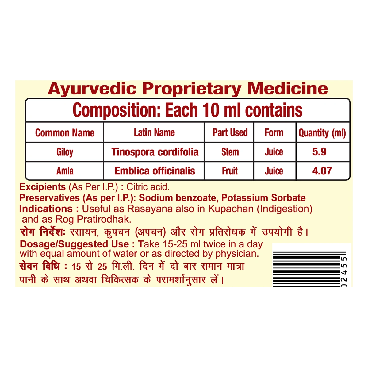 Amla Fruit (Emblica officinalis), Giloy Stem (Tinospora cordifolia), Citric Acid, Potassium Sorbate (Food Grade), Sodium Benzoate (Food Grade).