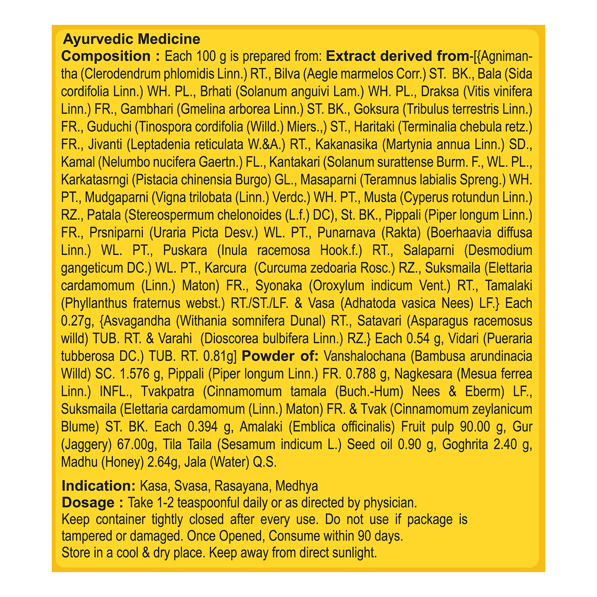 Agnimanth, Bilva, Bala, Brhati, Draksha, Gambhari, Gokshura, Guduchi, Haritaki, Jivanti, Kakanasika, Kamal, Kantakari, Kakratasrangi, Mashaparni, Mudgaparni, Musta, Patala, Pippali, Prishniparni, Punarnava, Pushkara, Shalaparni, Karkatshringi, Sukshmaila, Shyonaka, Tamalaki, Vasa, Ashwagandha, Shatavari, Varahi, Vanshalochana, Nagkesar, Tvakpatra, Tvak, Amalaki pulp, Jaggery (Gur), Sesame Oil, Cow Ghee, Honey.