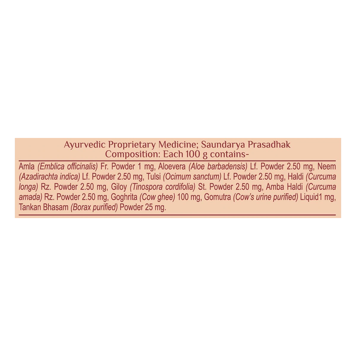Amla Powder, Aloevera Powder, Neem Powder, Tulsi Powder, Haldi Powder, Giloy Powder, Amba Haldi Powder, Cow Ghee, Purified Cow’s Urine, Tankan Bhasma