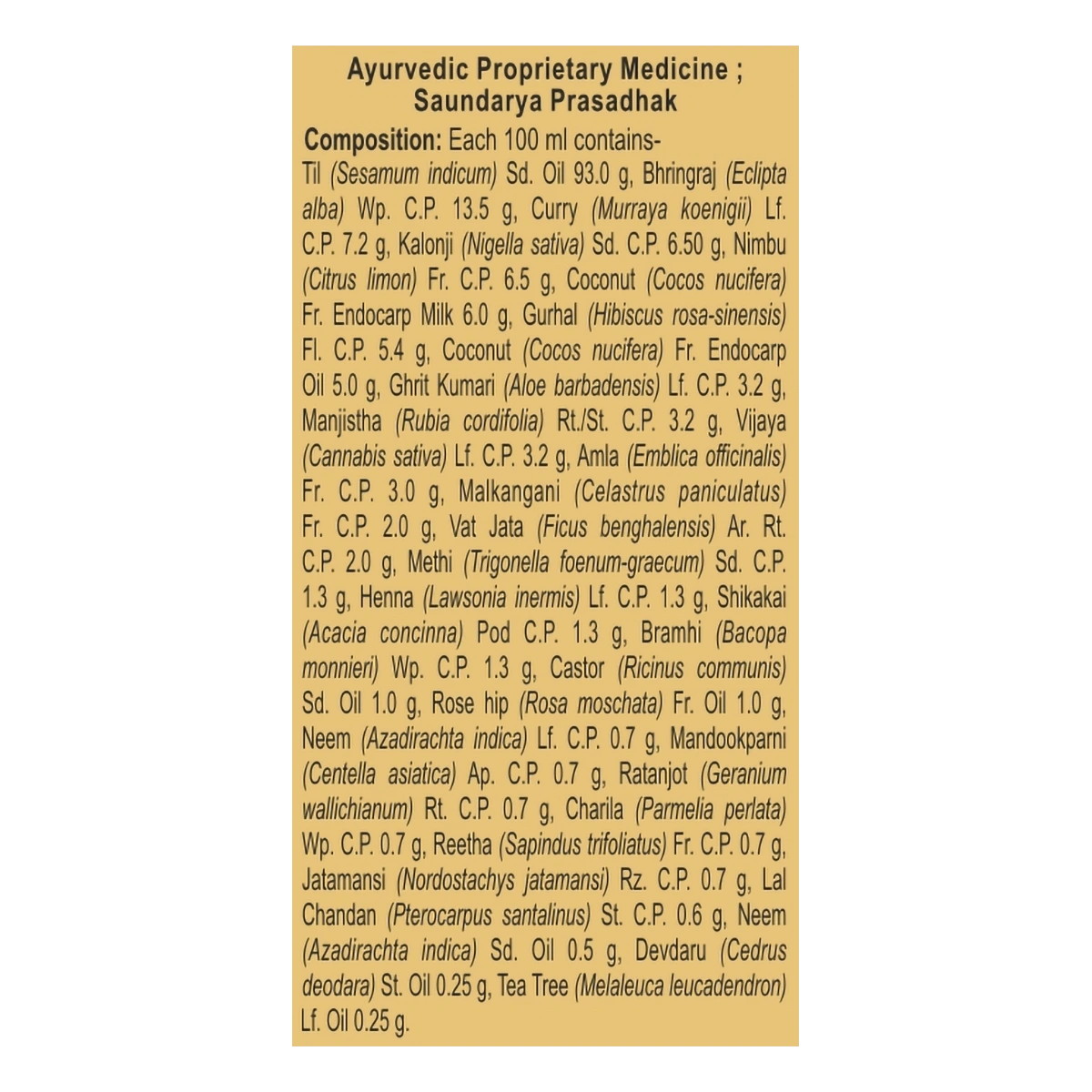 Til, Bhringraj, Curry Leaves, Kalonji, Nimbu, Coconut, Gurhal, Ghrit Kumari, Manjistha, Vijaya, Amla, Malkangani, Vat Jata, Methi, Henna, Shikakai, Brahmi, Castor, Rose Hip, Neem, Mandookparni, Ratanjot, Chari, Reetha, Jatamansi, Lal Chandan, Devdaru, Tea Tree.