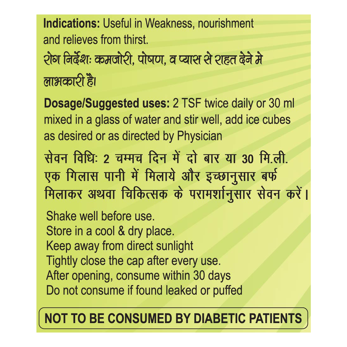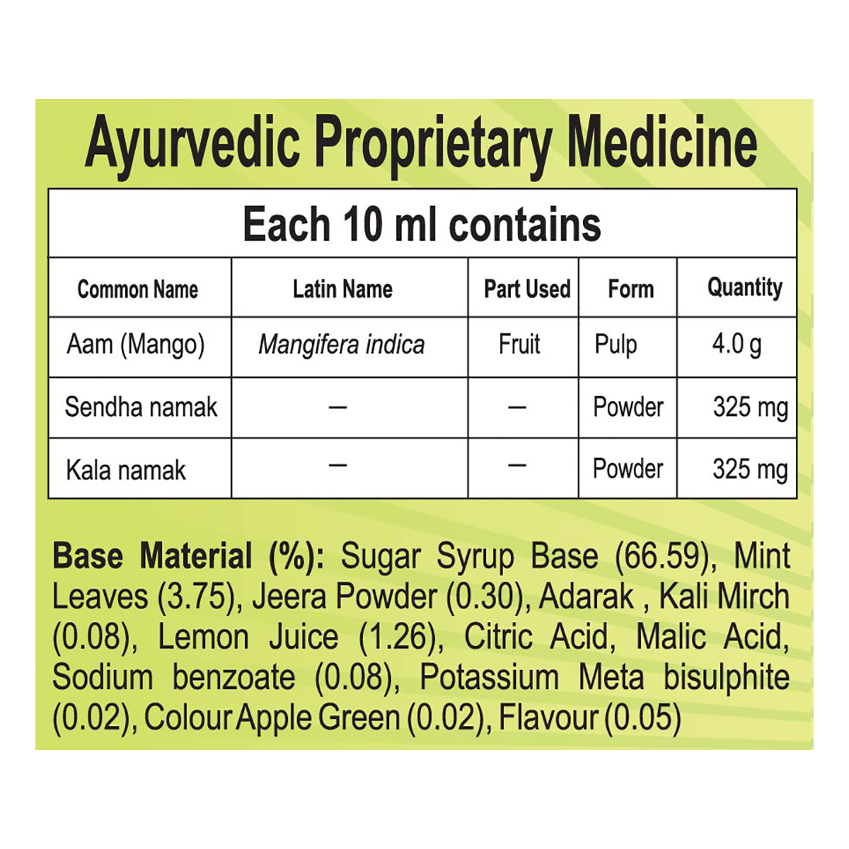 Aam (Mango), Sendha Namak, Kala Namak, Sugar Syrup Base (66.59%), Mint Leaves (3.75%), Jeera Powder (0.30%), Adrak, Kali Mirch (0.08%), Lemon Juice (1.26%), Citric Acid, Malic Acid, Sodium Benzoate (0.08%), Potassium Metabisulphite (0.02), Permitted Apple Green Colour (0.02), Flavour (0.05).