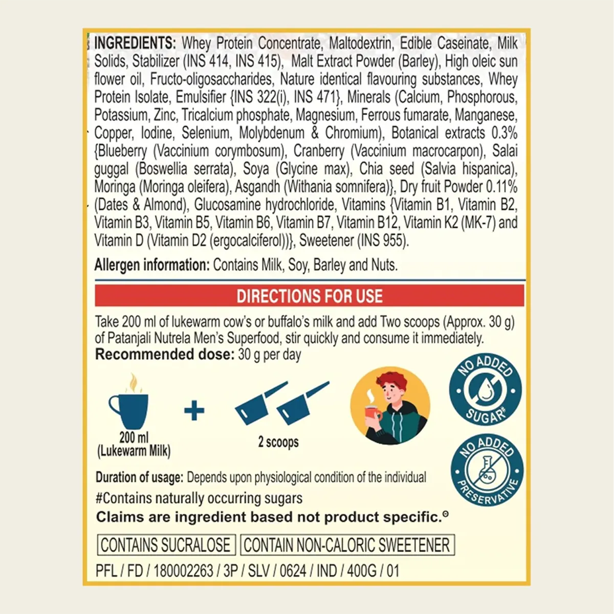 Patanjali Nutrela Men’s Superfood is a high-nutrition daily supplement crafted to support men’s strength, stamina, and overall vitality. With a blend of high-quality proteins, botanical extracts, essential minerals, and vitamins, it helps maintain energy levels, muscle health, and active lifestyle performance. Its delicious vanilla flavour makes it easy to include in your daily routine.