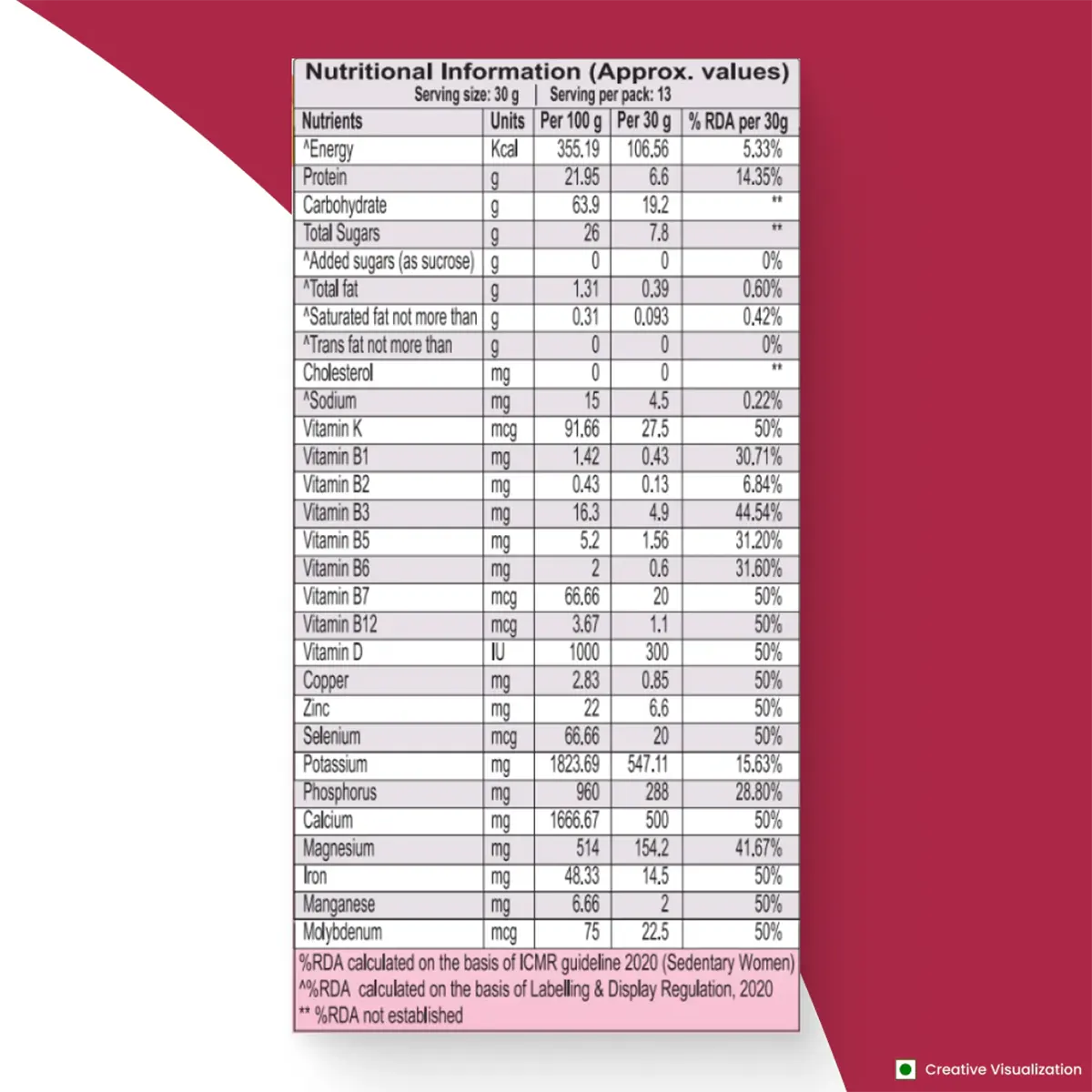 Milk solids, malt extract powder (barley), maltodextrin, whey protein concentrate, fructo-oligosaccharides, cocoa solids, minerals (calcium, phosphorous, potassium, zinc, tricalcium phosphate, magnesium, ferrous fumarate, manganese, copper, iodine, selenium, molybdenum, chromium), nature-identical flavouring substances, botanical extracts 0.6% (blueberry, cranberry, salai guggal, ginseng, agathi, curcuminoids, moringa, asgandh, fennel, shankhpushpi, kawach, shatavari, putrajivak, defatted fenugreek), glucosamine hydrochloride, lutein, vitamins (B1, B2, B3, B5, B6, B7, B12, K2 MK-7, D2), sweetener (INS 955).