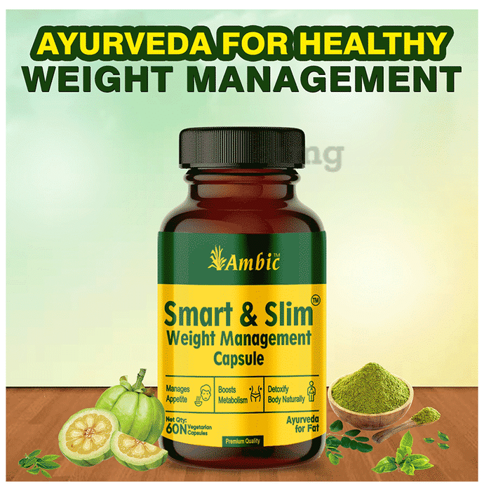 Ambic Smart & Slim Vegetarian Capsules are formulated using a thoughtful blend of traditional Ayurvedic herbs known for supporting natural metabolism and daily energy levels. This herbal combination includes Garcinia Cambogia, Medohar Guggulu, Green Coffee Seeds, and Moringa Leaf—ingredients traditionally used to help maintain a balanced appetite and support the body’s natural detox and nourishment process.