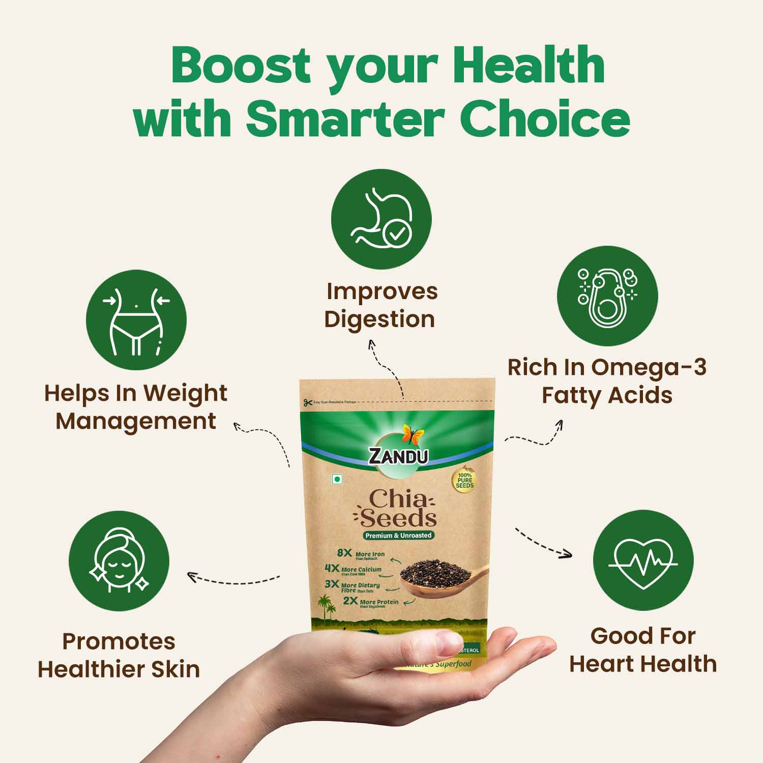 Zandu Natural & Premium Chia Seeds – Raw, Unroasted Superfood for Heart, Digestion & Energy
