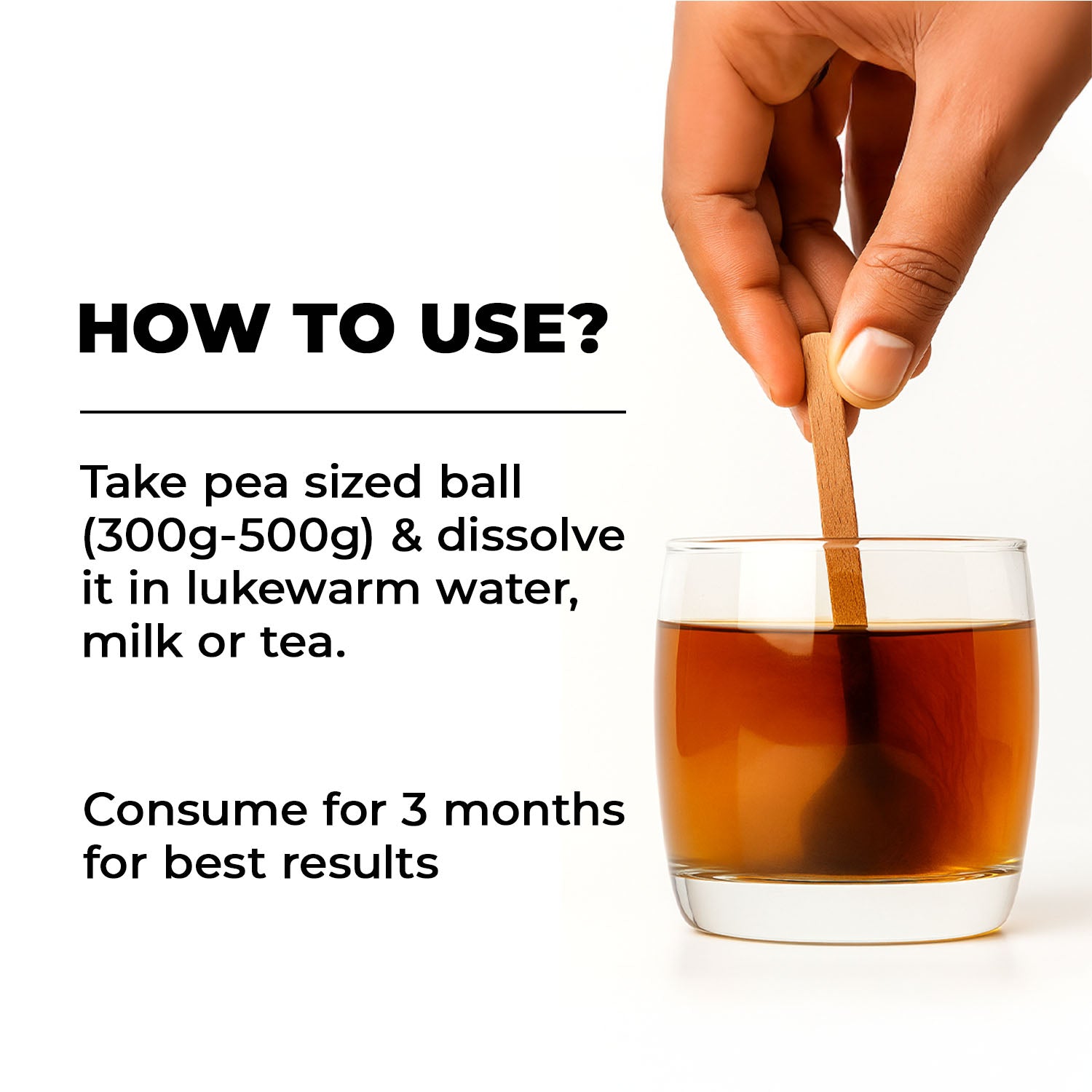 Take a pea-sized amount (approx. 250 mg) of Shilajit resin, dissolve it in warm water or milk, and consume once or twice daily, or as directed by a physician.